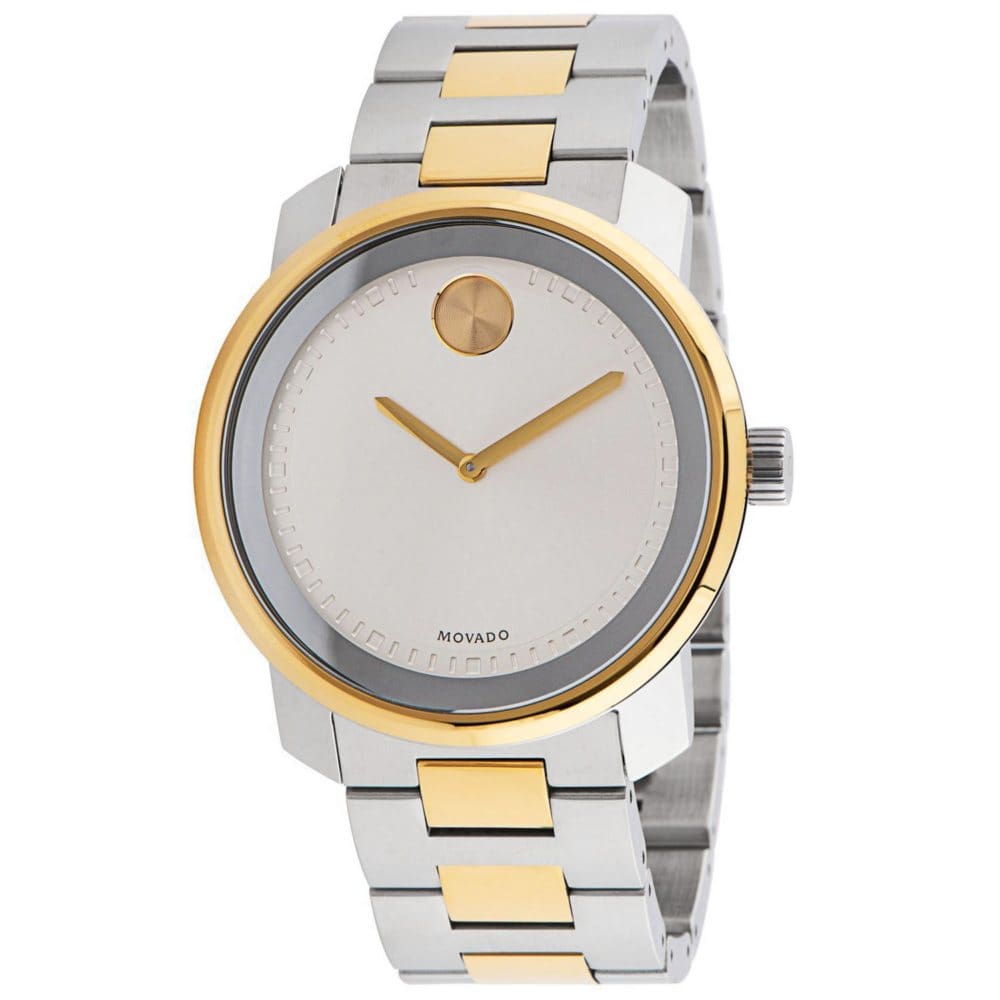 The Movado BOLD unisex watch (Model 3600431) offers a sleek, trendy sophistication with a modern design. This timepiece features a 42.5mm stainless steel and yellow gold ion-plated case and a K1 crystal with a ring of highly reflective, silver-toned metallization. The silver-toned dial has stamped hour/minute index, yellow gold-toned hands and a sunray iconic Movado dot at the 12 o’clock position. The stainless steel and yellow-gold ion-plated link bracelet utilizes a push button deployment clasp that is both secure and also offers ease of use. This iconic wristwatch includes all the quality components you expect from Movado.