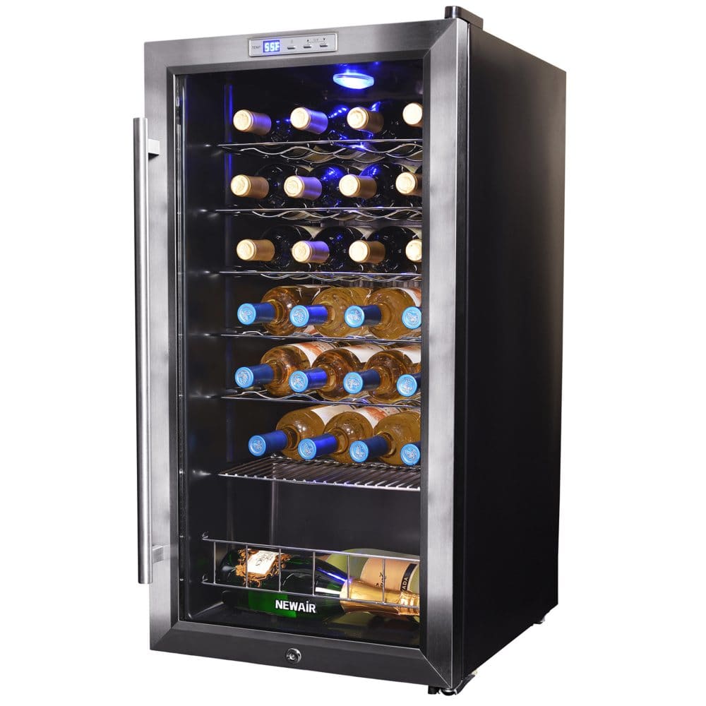 The NewAir AWC-270E 27 bottle wine cooler is a compressor-based system that can cool down to 39 degrees Fahrenheit. With a digital control panel and precise temperature control, it is a great way to preserve your new wine collection or as an addition to your existing wine cellar. 5 sliding chrome shelves and a bottom storage bin offer flexible storage for up to 27 bottles of wine or other beverages and snacks. It features an electronic thermostat and digital controls on the outside of the unit, so you can monitor and adjust settings as needed. Insulated glass doors are energy efficient and protect your wine from excessive UV light. A sturdy lock keeps unwanted hands away from your wine.