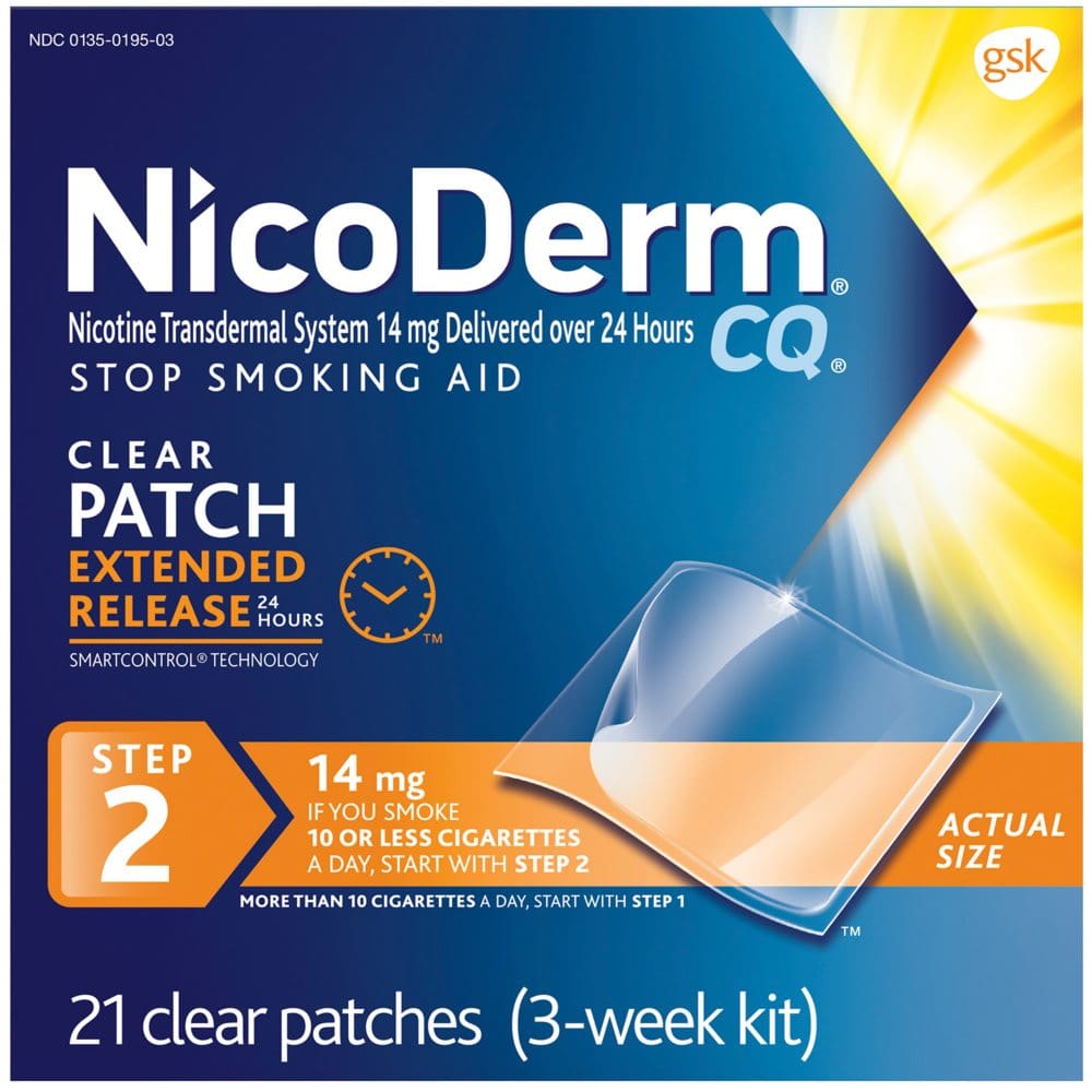 - Three week supply of NicoDerm CQ Nicotine Patch Step 2, 14 mg