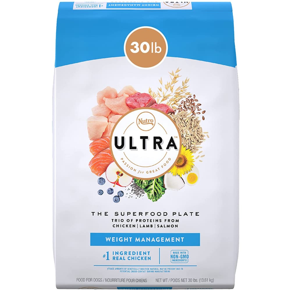 Our Weight Management Dry Dog Food is full of healthy , a delicious taste and the essential vitamins and minerals needed to help get dogs back to their ideal weight.Chicken, Chicken Meal (source of Glucosamine and Chondroitin Sulfate), Whole Brown Rice, Brewers Rice, Rice Bran, Whole Grain Oatmeal, Lamb Meal (source of Glucosamine and Chondroitin Sulfate), Pea Protein, Natural Flavor, Salmon Meal, Chicken Fat (preserved with Mixed Tocopherols), Dried Plain Beet Pulp, Whole Flaxseed, Sunflower Oil (preserved with Mixed Tocopherols), Potassium Chloride, Choline Chloride, DL-Methionine, Salt, Mixed Tocopherols and Citric Acid (preservatives), Dried Coconut, Whole Chia Seed, Dried Egg Product, Tomato Pomace, Dried Kale, Dried Pumpkin, Dried Spinach, Dried Blueberries, Dried Apples, Dried Carrots, Zinc Sulfate, Niacin Supplement, Biotin, Vitamin E Supplement, Iron Amino Acid Chelate, D-Calcium Pantothenate, Riboflavin Supplement (Vitamin B2), Selenium Yeast, Vitamin B12 Supplement, Copper Amino Acid Chelate, Pyridoxine Hydrochloride (Vitamin B6), Manganese Amino Acid Chelate, Vitamin A Supplement, Thiamine Mononitrate (Vitamin B1), Vitamin D3 Supplement, Folic Acid, Rosemary Extract."