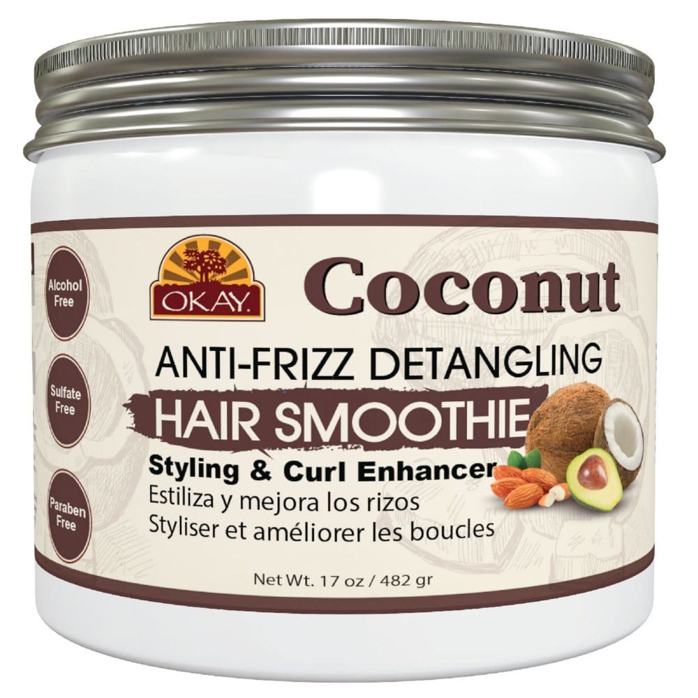 Okay Coconut Anti-Frizz Detangling Hair Smoothie helps to enhance definition to curls, waves, and coils for beautiful eye-catching hairstyles such as wash and goes, twists and twist outs, Bantu knot outs, braids, braid outs and much more. With this smoothie, the styling possibilities are endless.