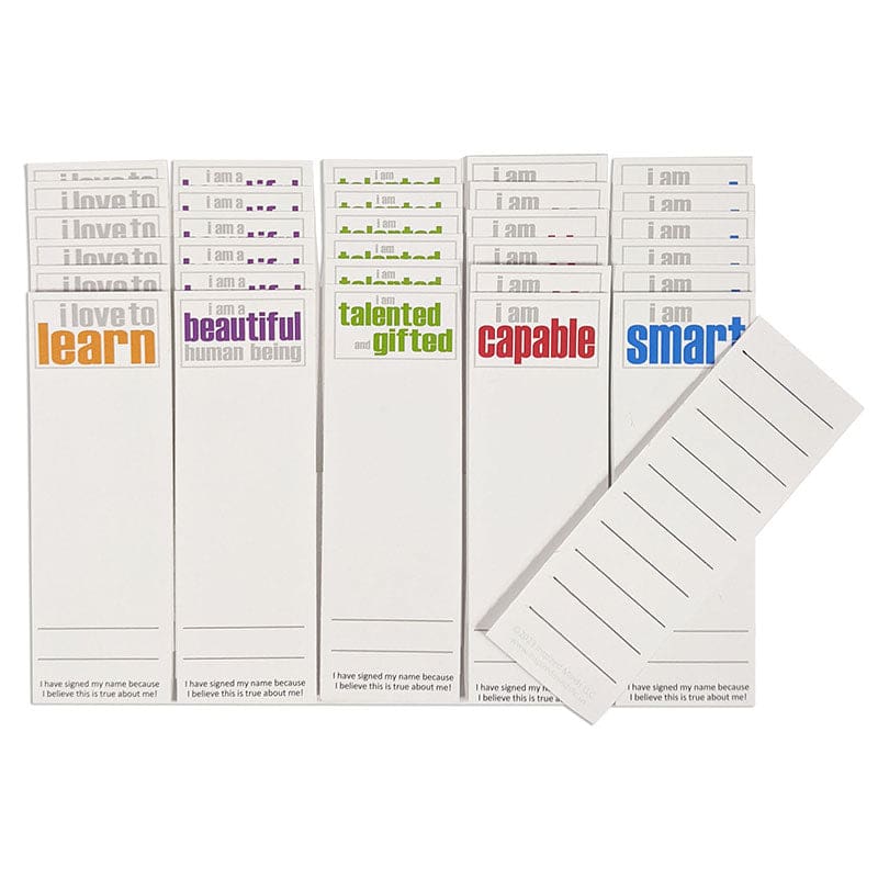 This Inspired Minds Self-Esteem Booster Set consists of 30 Page Keepers. There are 5 statements intentionally printed simple, yet colorful, to offer an impactful and creative way to help gain self-esteem and build character to last a lifetime. These page keepers not only work as a daily reminder, but can be signed to take ownership of believing in yourself! Because these are uncoated, with the blank space in the front and lines on the reverse side, there are unlimited uses. Draw, color, add pictures, list books, friends, story content or favorite characters, record reading time, and the list goes on! Laminate as a keepsake! Page keepers measure 2" x 6". Set has 6 each of the 5 titles that match all Self-Esteem Booster Sets.