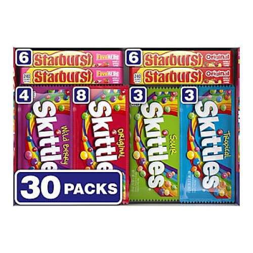 Enjoy a variety of fruity flavors with this Skittles and Starburst bulk chewy candy variety box. Delight Skittles candy fans with all of their favorite varieties, including Skittles Original, Skittles Wild Berry, and Skittles Sour candy. And you can't forget about the Starburst Candy lovers in your life. Surprise these fruity-candy enthusiasts with Starburst Original and Starburst FaveReds chewy candy. Skittles Original candy features strawberry, green apple, lemon, orange, and grape flavors. Skittles Sour candy contains mouth-puckering sour strawberry, sour green apple, sour lemon, sour orange, and sour grape flavors. Skittles Wild Berry includes berry punch, strawberry, melon berry, wild cherry, and raspberry flavors. Get the best of both Starburst fan-favorite flavors in this bulk candy pack. Starburst Original features strawberry, cherry, orange, and lemon flavors. Starburst FaveReds contains strawberry, fruit punch, watermelon, and cherry flavors. With 30 Full Size packs in every box, this bulk chewy candy assortment has enough candy for stocking the office pantry or packing in your family's lunches. Fruity, chewy, and loved by all, keep everyone's favorite colorful candies on hand with this assortment of Skittles and Starburst Candies. Perfect for parties, game-time and movie night snacks, or simply enjoyed as an afternoon treat. Bring more fruity candy fun to your pantry with this bulk candy assortment. Look no further for bulk candy individually wrapped, 30 packs of Skittles and Starburst chewy candy will fit all your candy-filled occasions.
