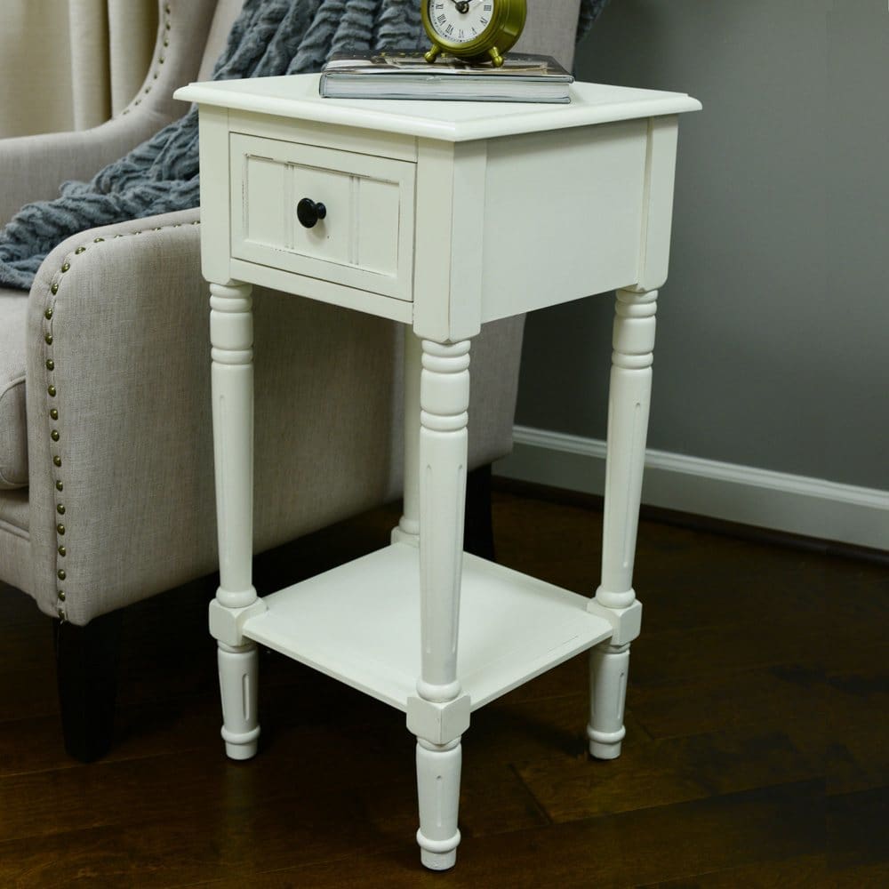 This shabby chic Square Accent Table will add a touch of vintage style to your home. The carefully distressed finish lends character, while the bronzed knobs add a layer of elegance. Use the table next to your bedside as a nightstand. Or place it by a couch a table lamp and colorful vase of flowers. The compact table is ideal for small spaces.