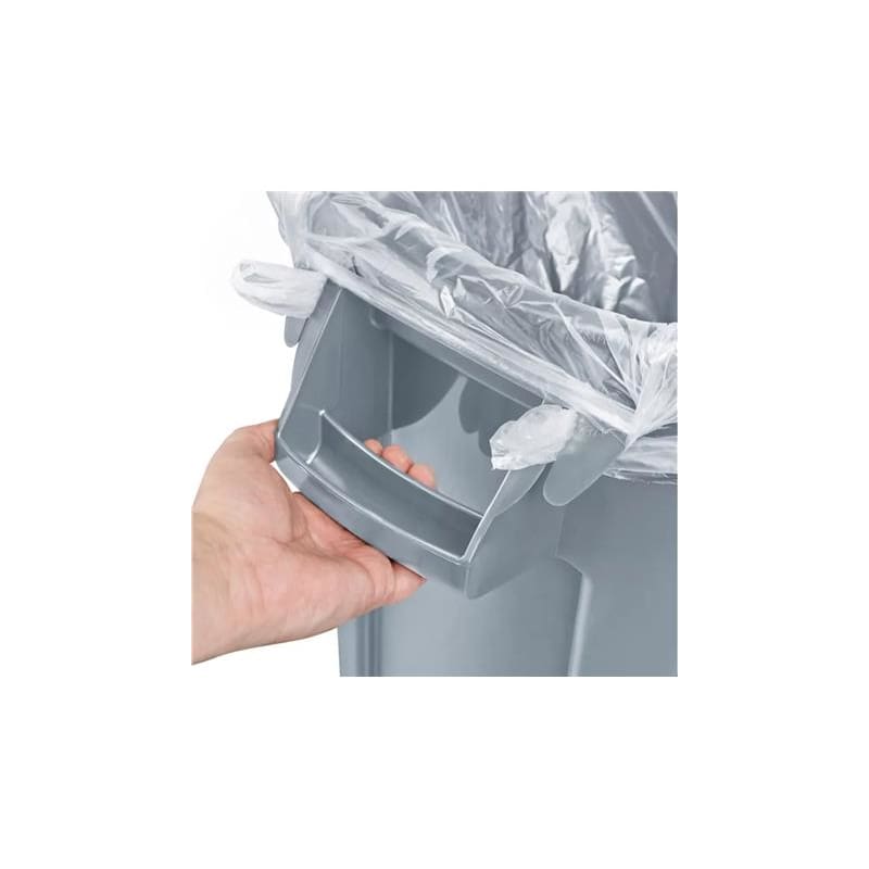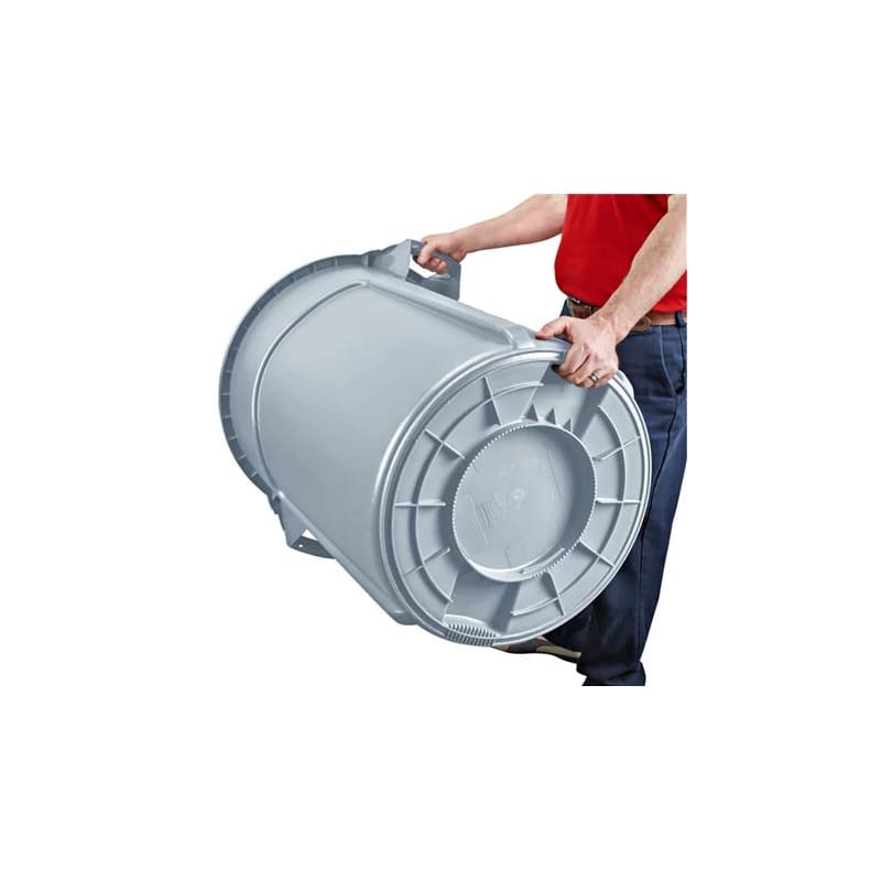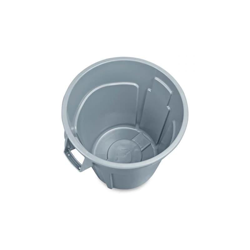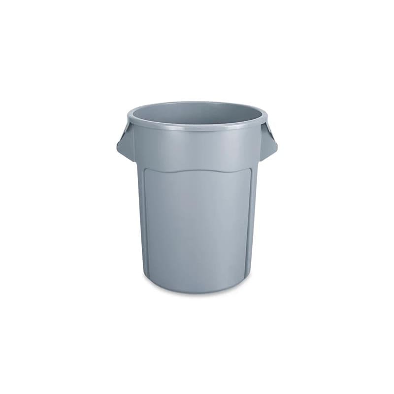 Rubbermaid Brute 55 Gallon Trash Can. These tough trash cans can handle heavy loads, with heavy-duty plastic construction that resists denting, bending, and cracking. Molded-in handles make lifting easier and vented side channels make for easy trash liner removal. USDA compliant and NSF certified. Dimensions: 33"H x 27"D Outside, 32.5"H x 24.75"D inside, 30.75" width with handles. Weight Capacity: 435 lbs., Weight: 16 lbs., Color: Grey.