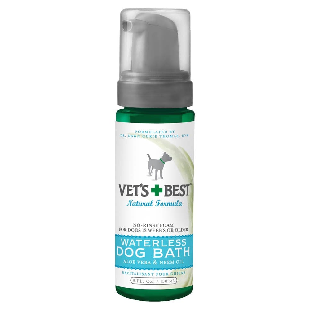 Vet's Best Waterless Dog Bath is a no-rinse foam dog shampoo that acts as a calming cleanser and moisturizer for your dog's skin and coat between baths. Waterless Dog shampoo is veterinarian formulated using natural ingredients (aloe vera and neem oil) and has a relaxing and calming fragrance. For use with dogs 12 weeks or older, and will not affect topical flea control products. The perfect solution when water is unavailable or in cold weather. Vet's Best Waterless Dog Bath is a no-rinse dog shampoo that moisturizes skin and coat between baths|Quick, simple, and easy solution to bathe dogs in cold weather, while traveling, or when water is unavailabe|Waterless dog shampoo is formulated by veterinarians uses key natural ingredients (aloe vera, micronized oatmeal, neem oil) that has a relaxing and calming fragrance|Dog shampoo for dry skin for use with dogs 12 weeks or older|Vet's Best waterless dog shampoo will not affect topical flea control products