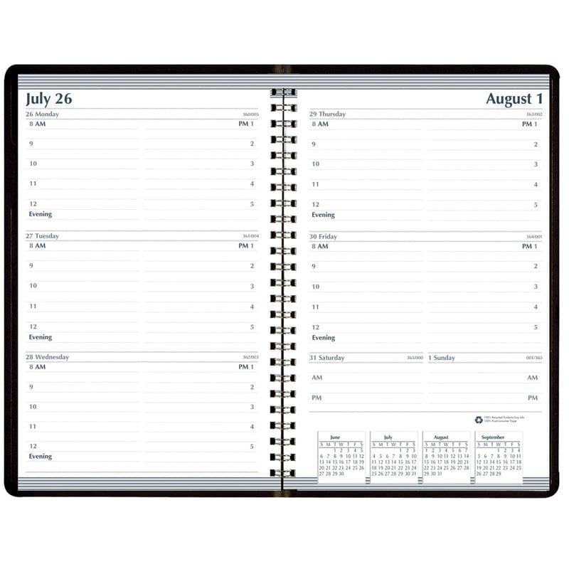 House of Doolittle Weekly Academic Planner features 13 Months, July-July, and measures 5" x 8". Our planner book is perfect for the busy professional or student with room to note necessary appointments and needed information. One week per two page spread with generous space for important information, each day space is lined for optimum use, includes monthly planning section, three year reference calendar, and Julian dates/days. Wire bound with a classic black embossed simulated leather cover. Additional information pages include important dates and holidays, 3 year at a glance calendar, United States time zones, lined notes page, 4 lined contact information pages. This personal planner is geared for a teacher, a student, a Mom, a Dad or any professional who is looking to keep their life and tasks organized. Go green with House of Doolittle products, we print on 100% post-consumer recycled paper with soy-based inks. Wire binding is 90% recycled. Cover is at least 50% recycled material. All of our products are manufactured in the USA and are FSC certified.