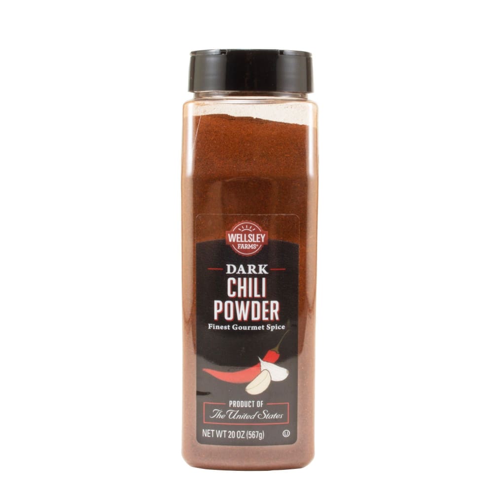 Wellsley Farms Dark Chili Powder gives a deep rich flavor and color to Southwestern chili, tacos and beans. This dark chili powder spice is great to use for seasoning chicken or beef before roasting or grilling. This Kosher product has a 365 day shelf life.