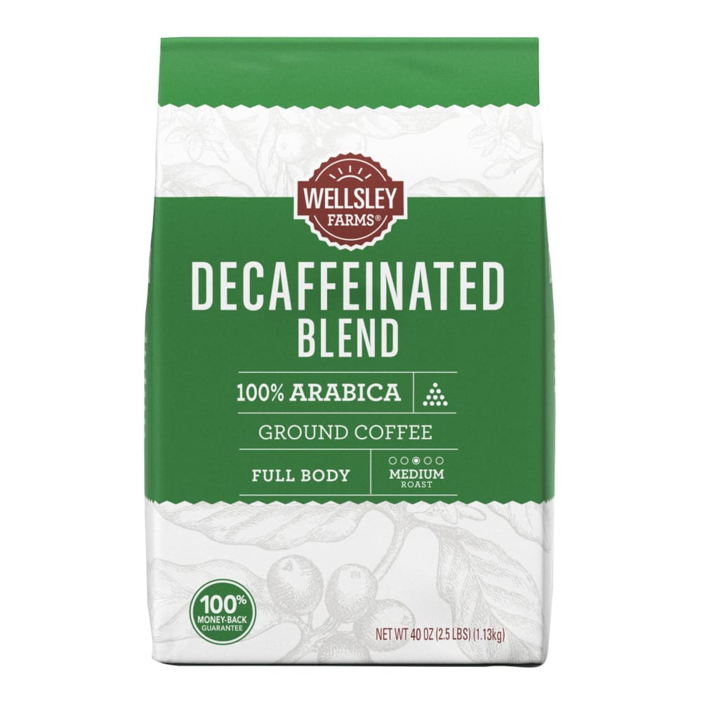Enjoy java without the jitters with this Wellsley Farms 40 Oz. Decaffeinated Blend Ground Coffee. The decaf blend is made from 100% Arabica beans for a robust flavor, but has had more than 99% of the caffeine removed. Roasted in small batches, the coffee delivers a full flavor and wonderful aroma.