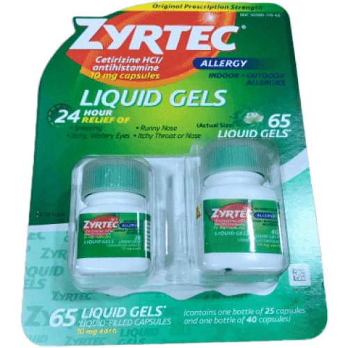 Zyrtec Allergy provides fast 24 hour relief from your worst allergy symptoms, indoors and out. The fast, powerful relief of Zyrtec in a liquid gel - starts working within an hour. Contains one bottle of 25 capsules and one bottle of 40 capsules.